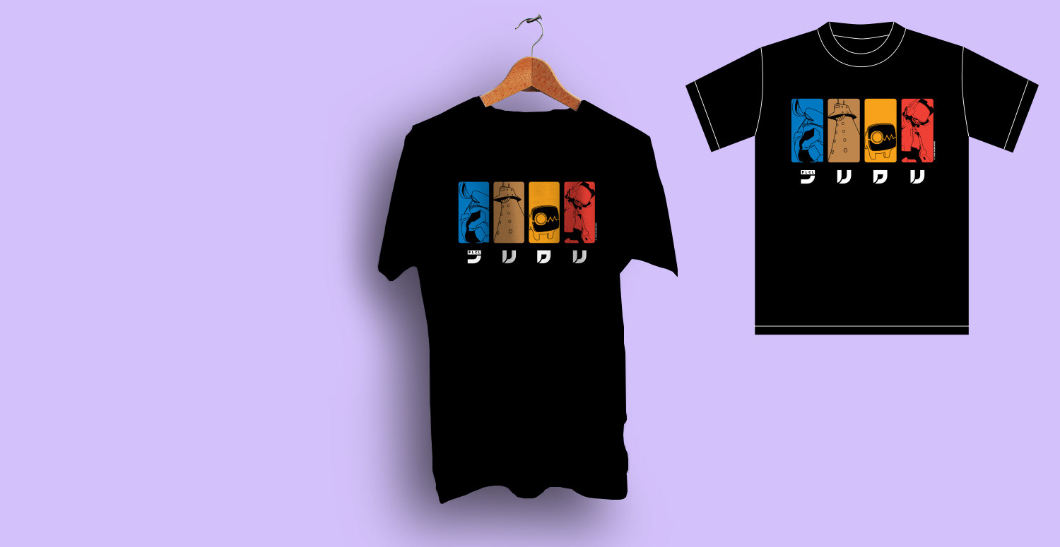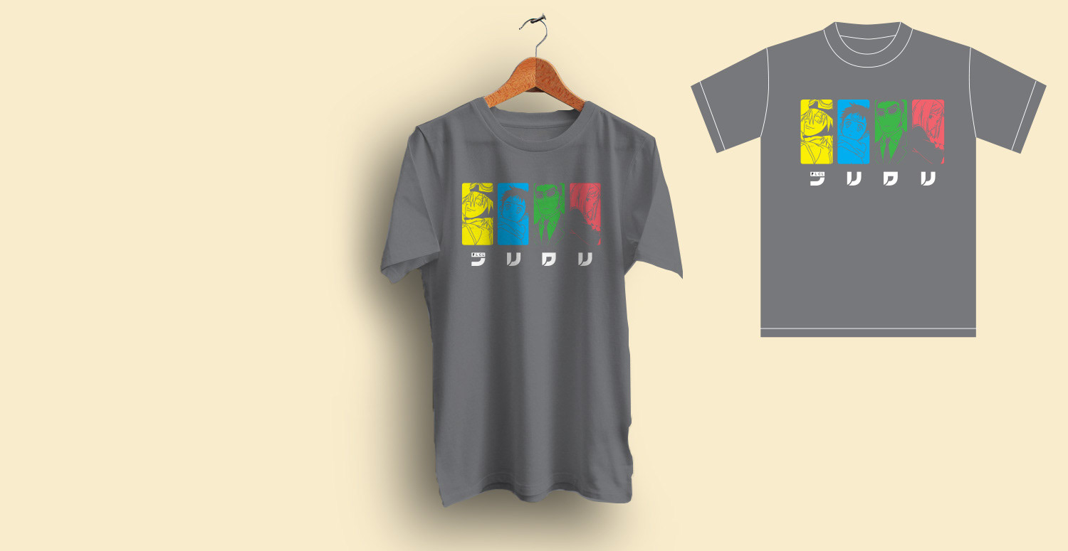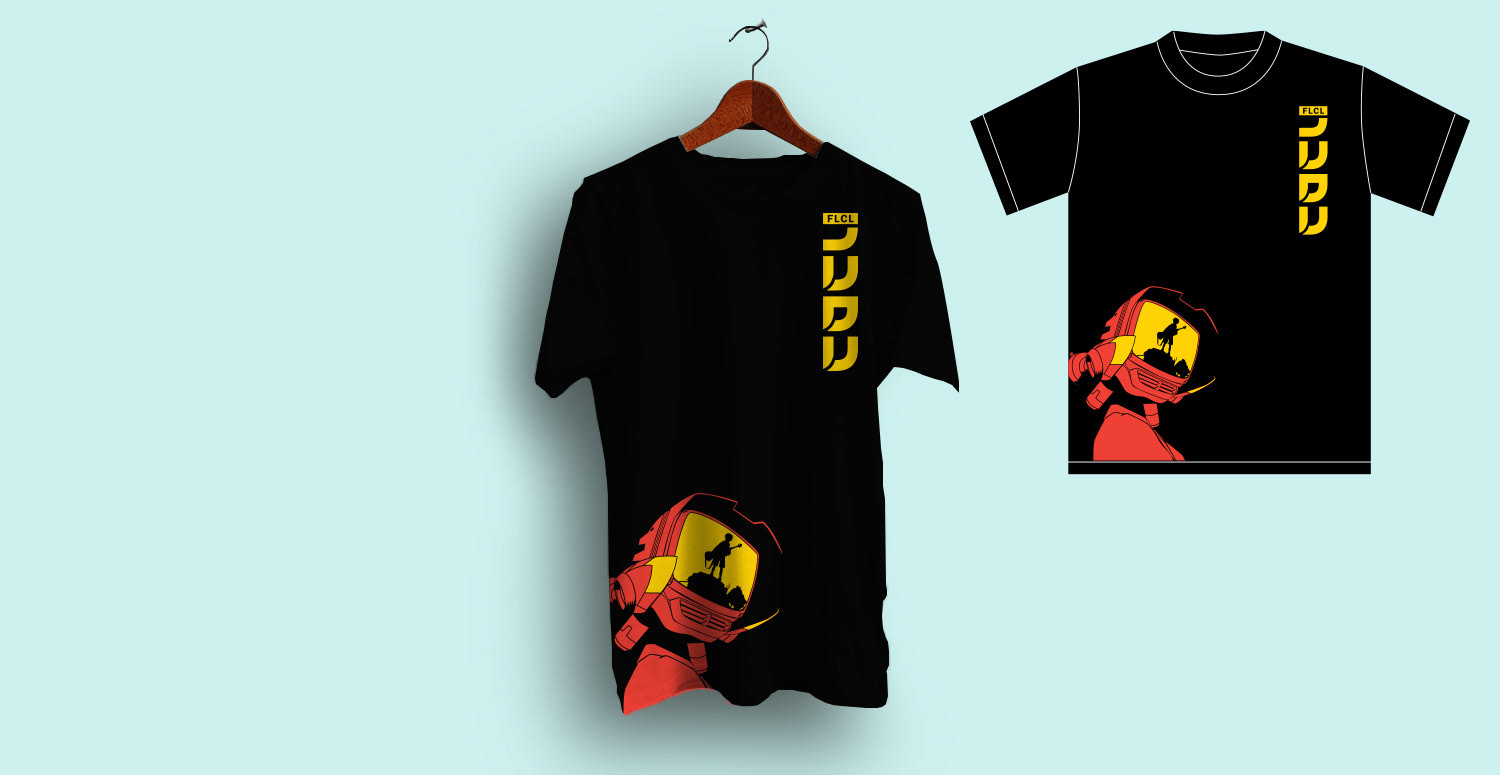 As a fan of the FLCL anime series, it was a dream come true to actually design official t-shirts for the show that were sold at conventions. FLCL is all about bold colors and lots of memorable characters and scenes, so I wanted to capture that in a shirt.
