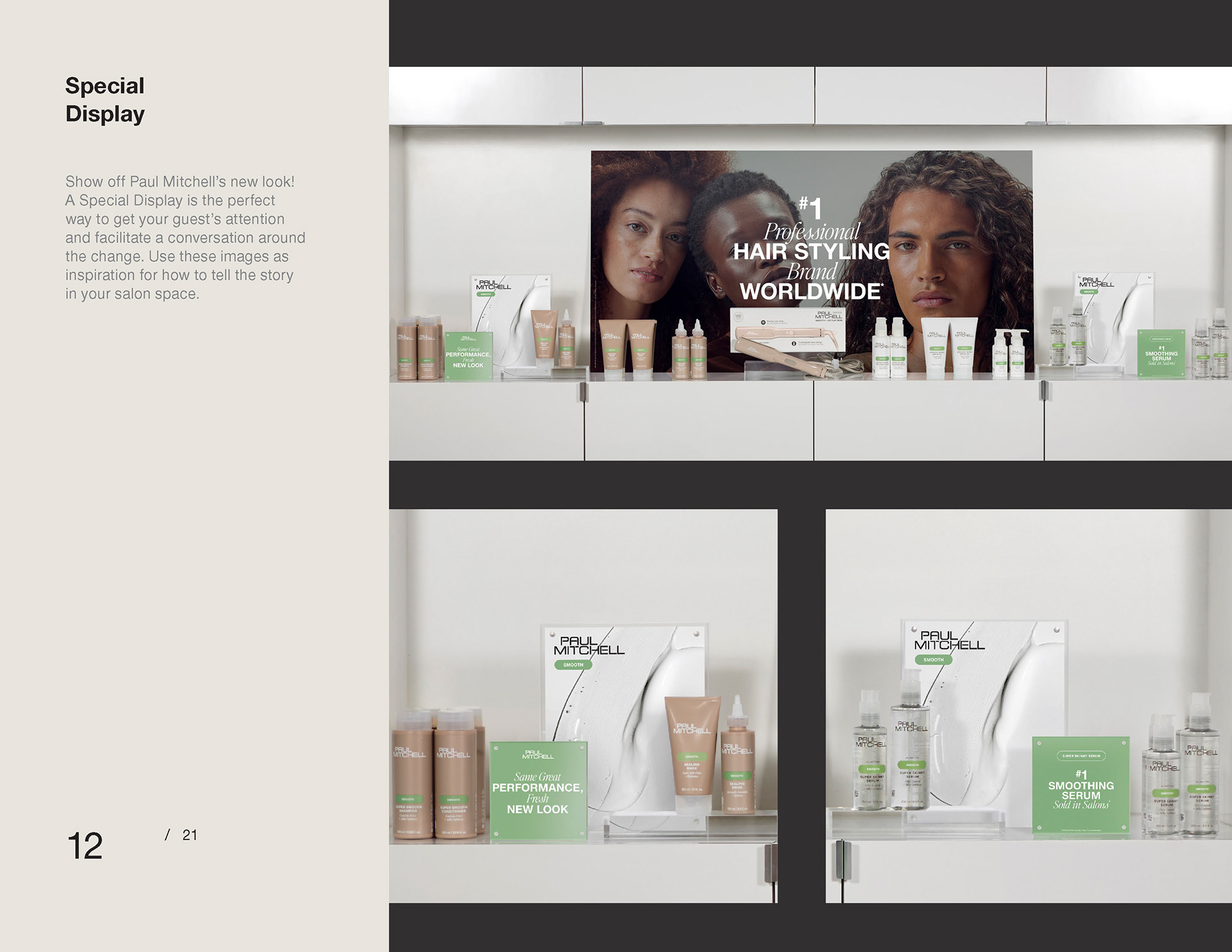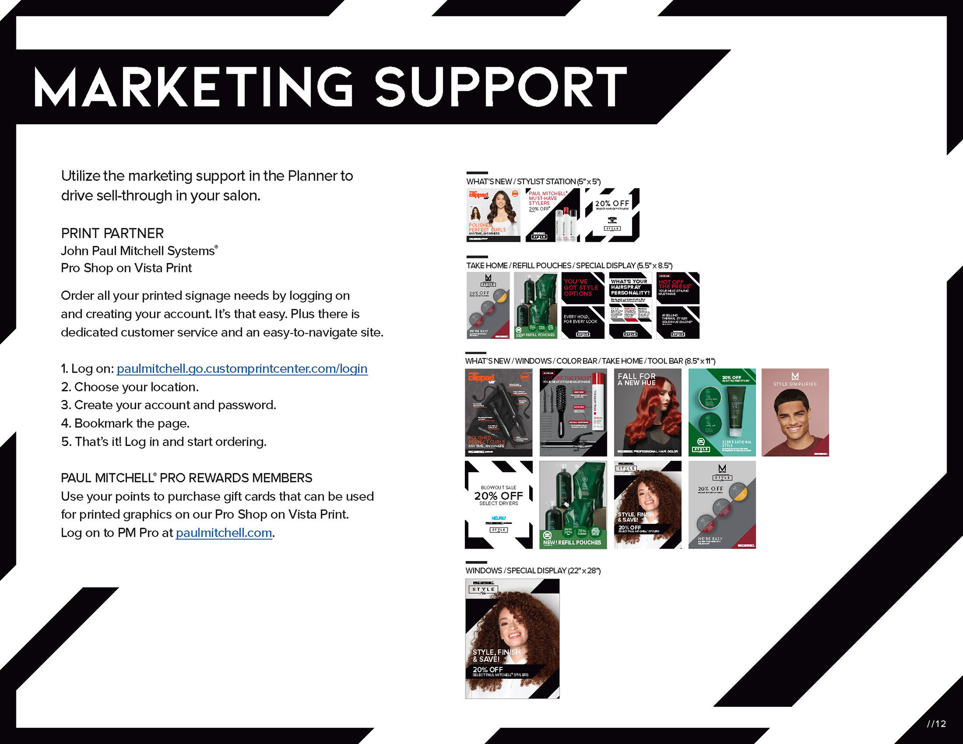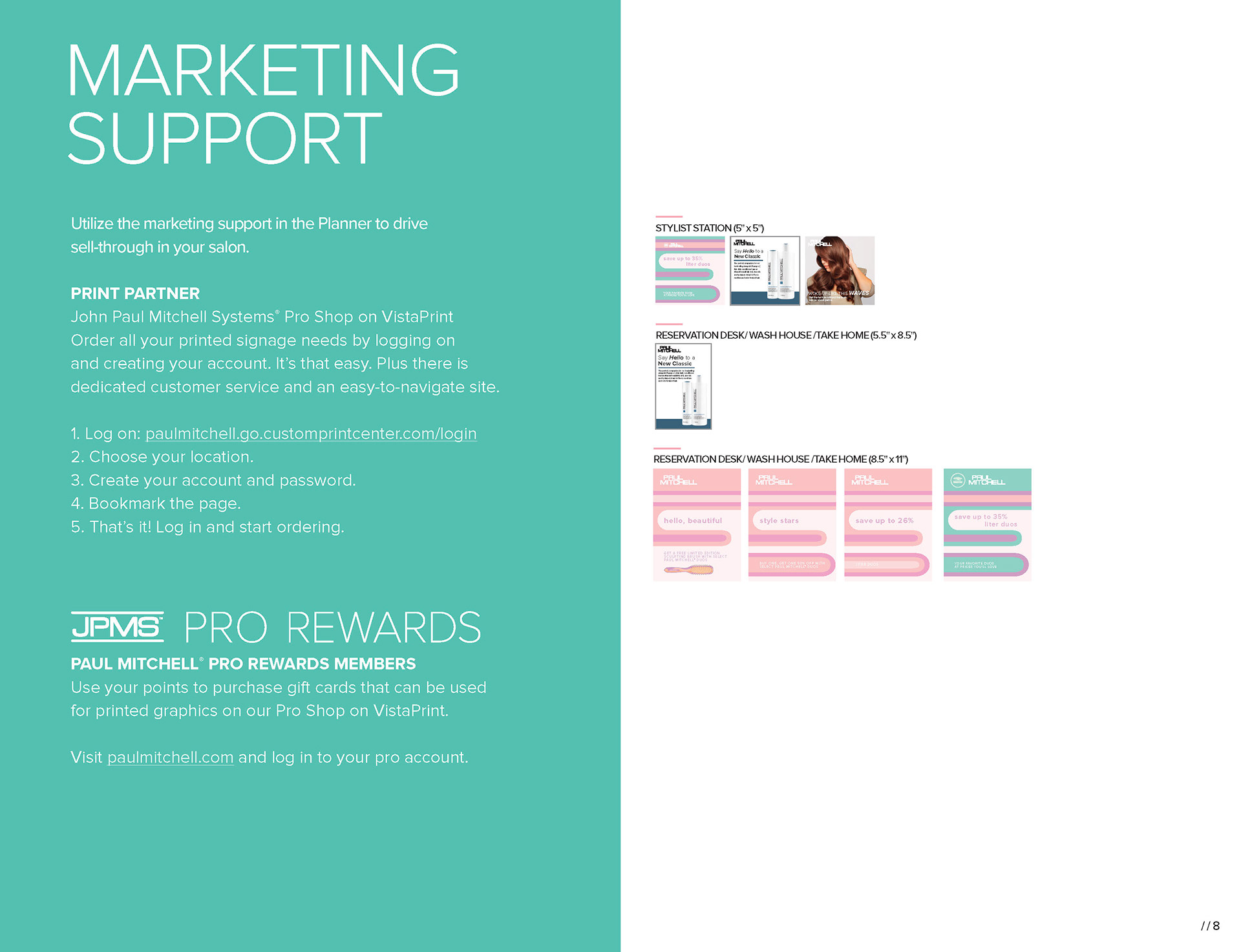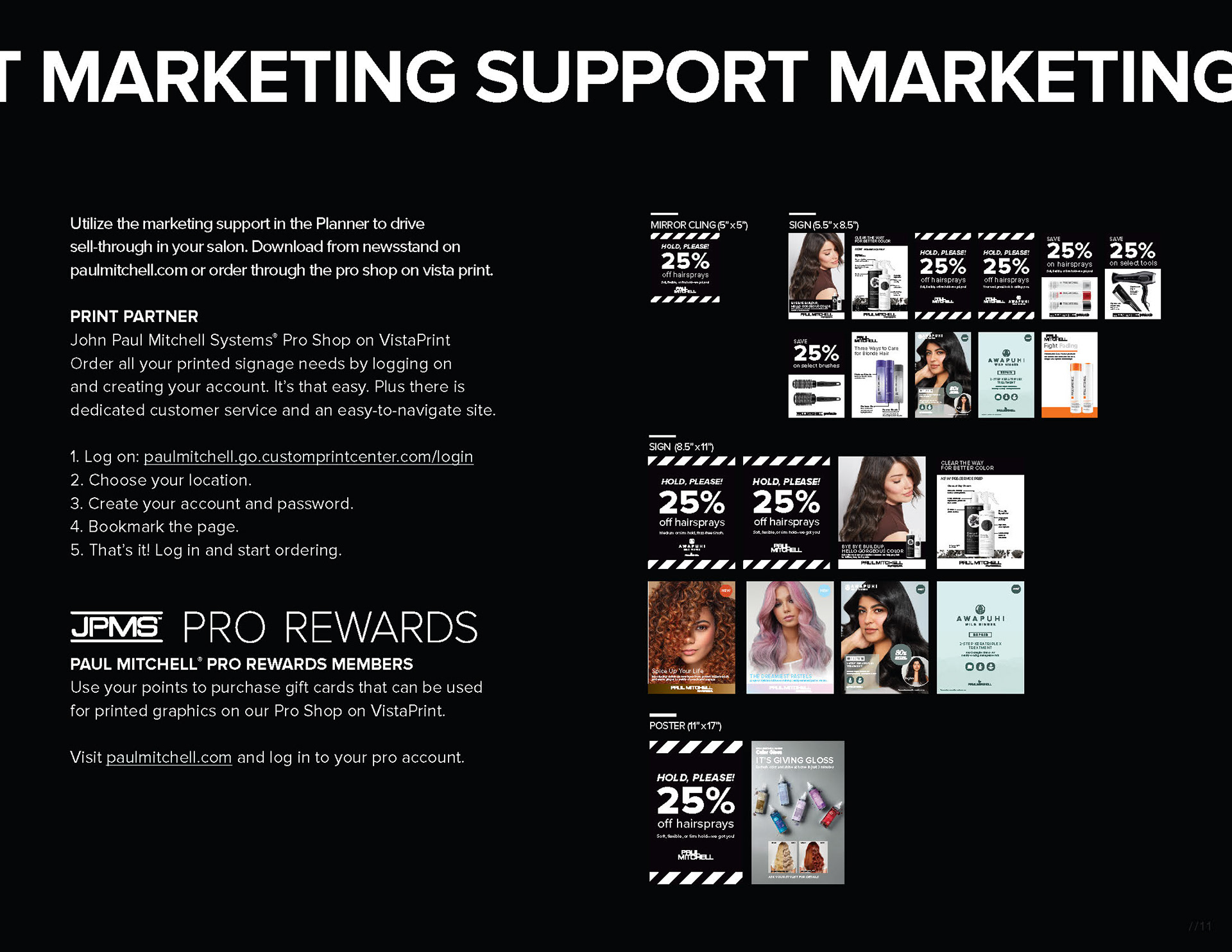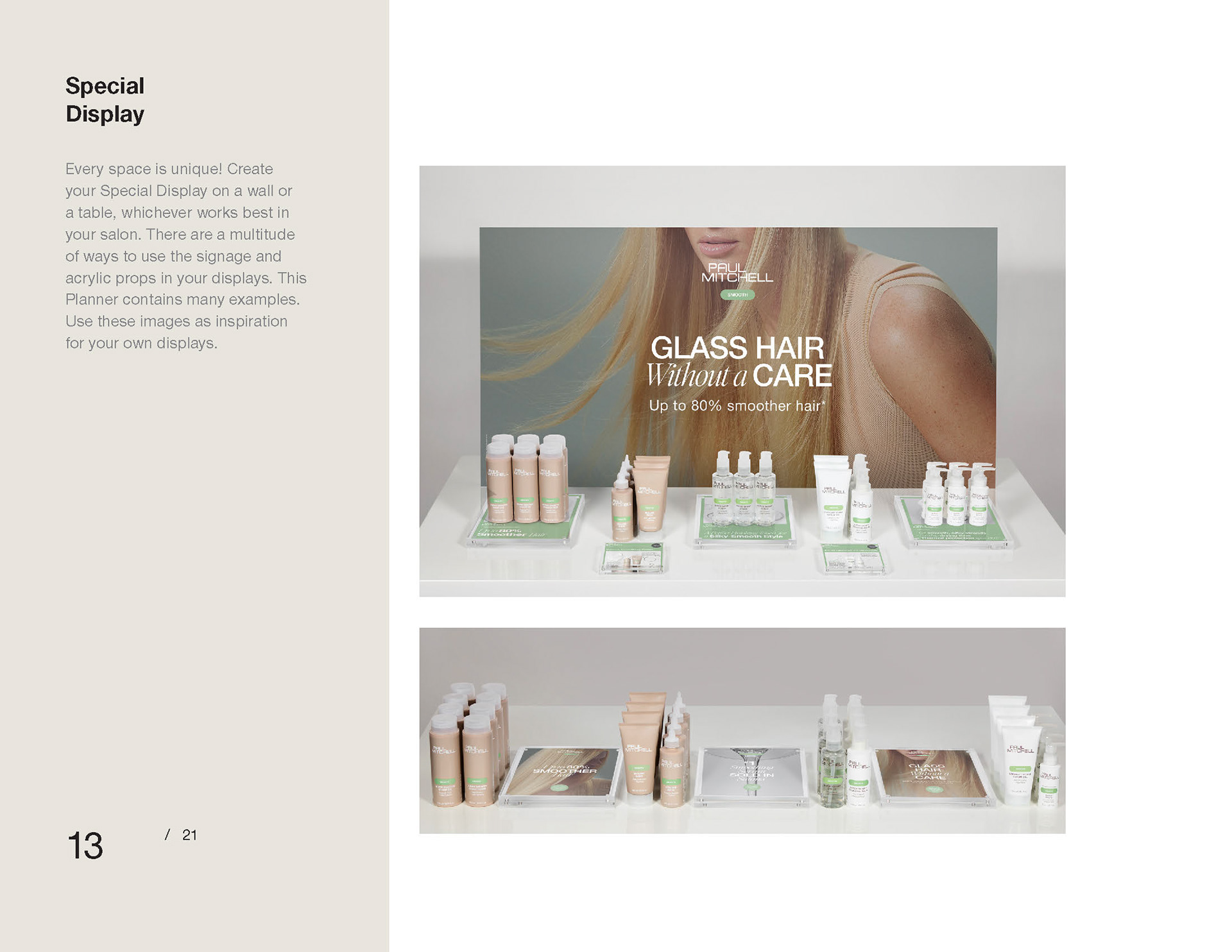 "The Planner" is a quarterly brochure given to salons and vendors to show them how to merchandise and display the newest JPMS product releases. All of the POPs featured in the examples are included with the brochure. For each Planner I was usually given some art direction by the merchandising department, but otherwise I would have free reign to design while making sure I kept on brand. I would also collaborate with Jennifer Zappia, the production manager, when the project featured multiple product focused planners.