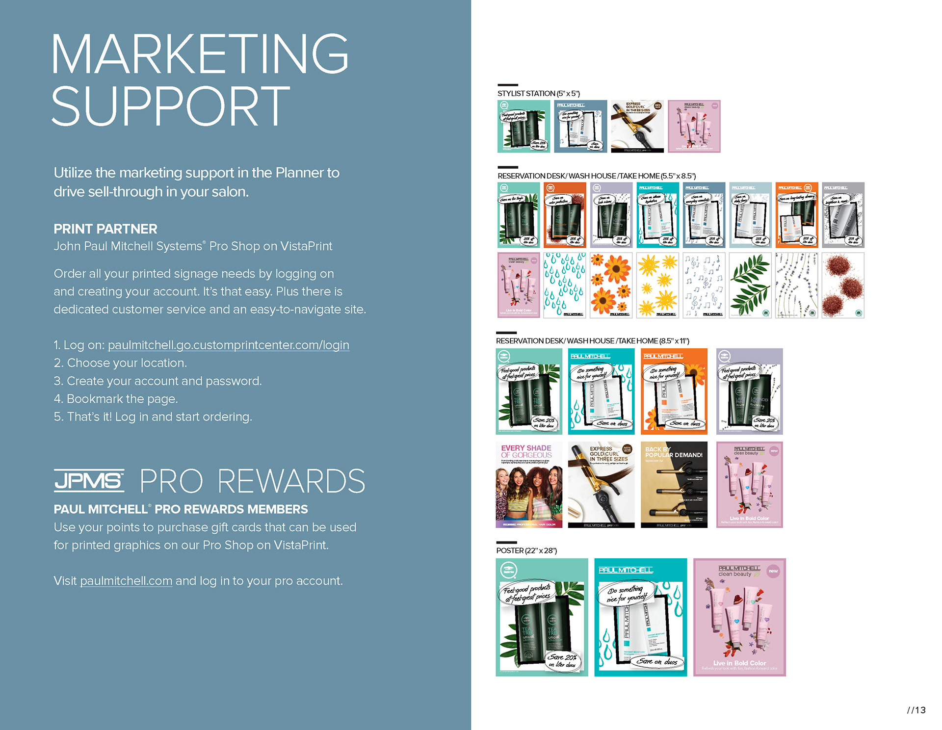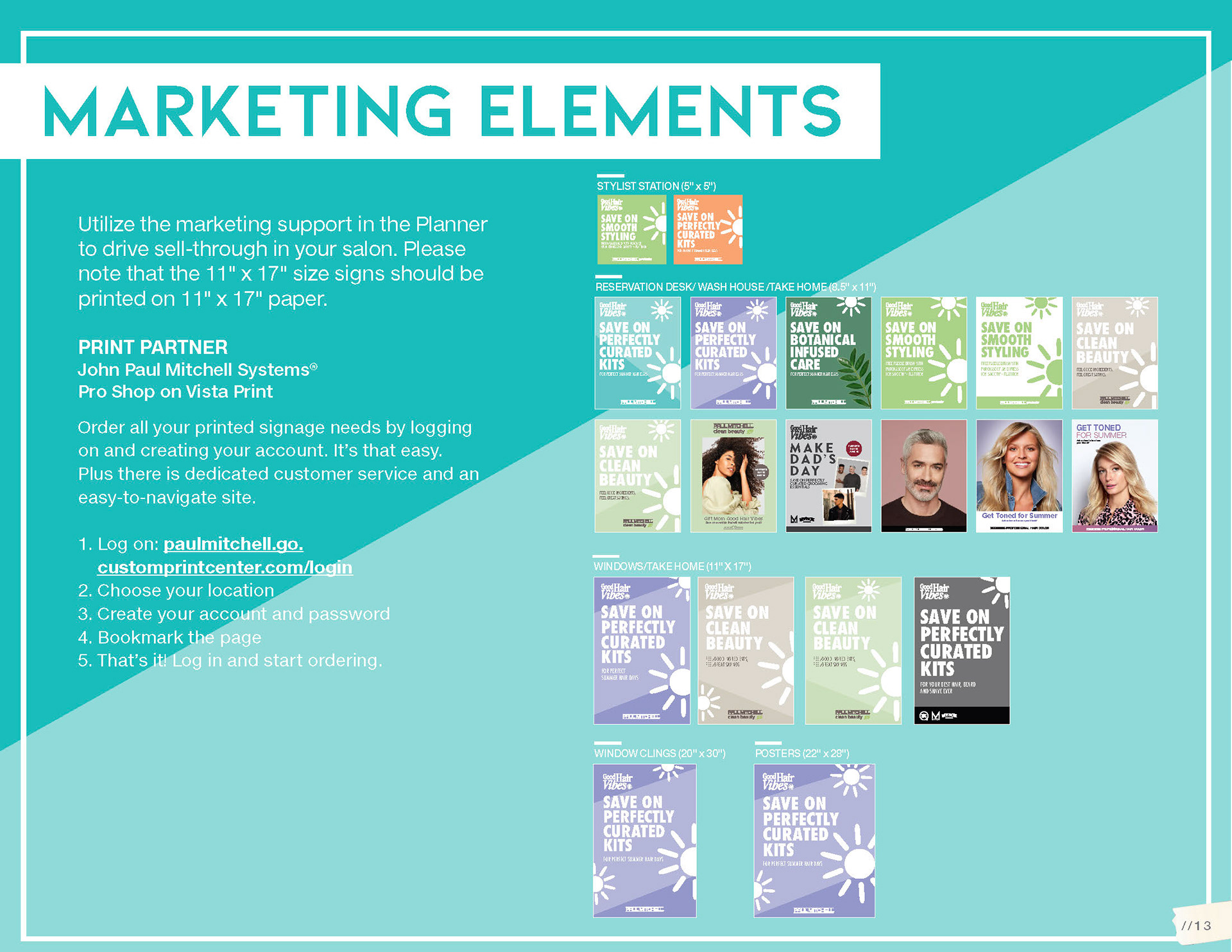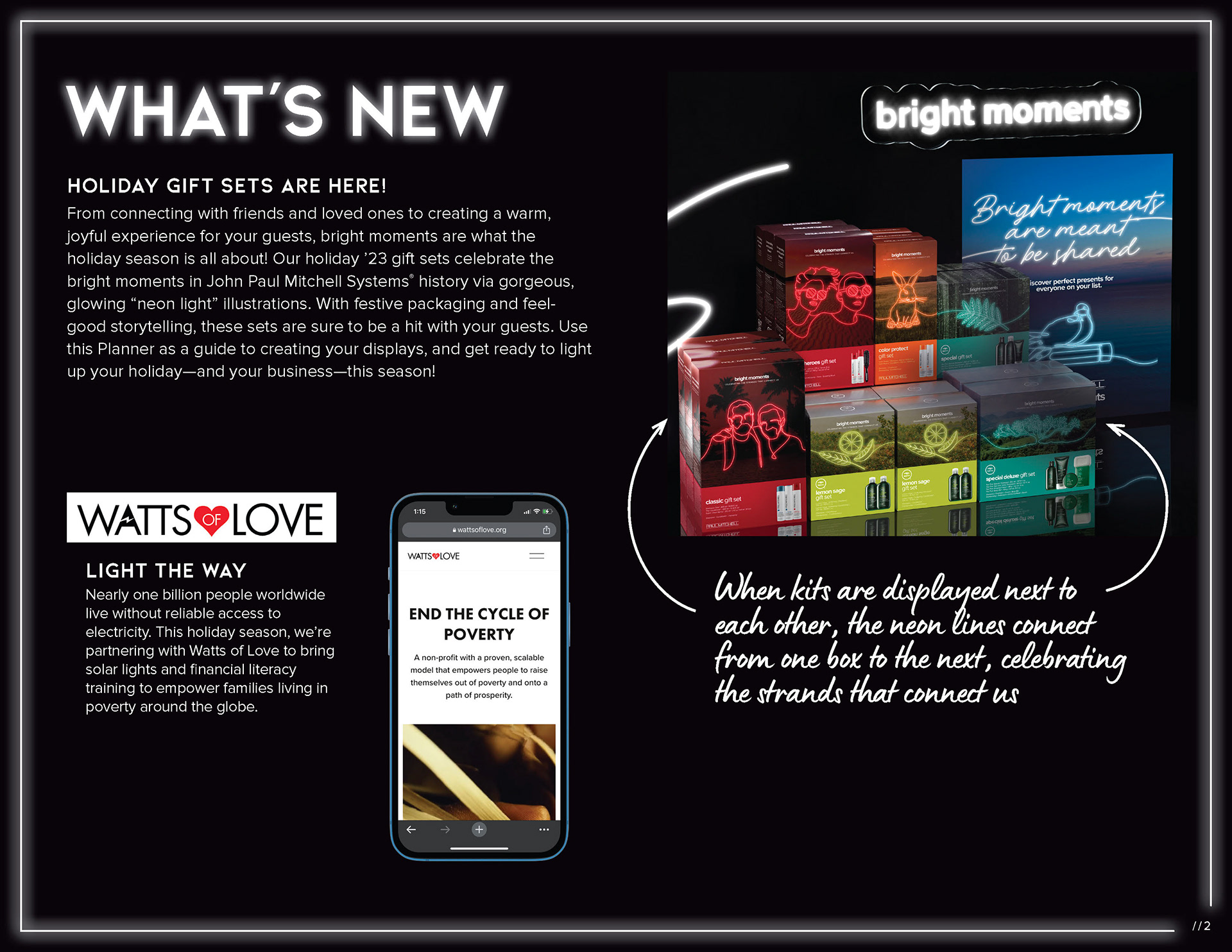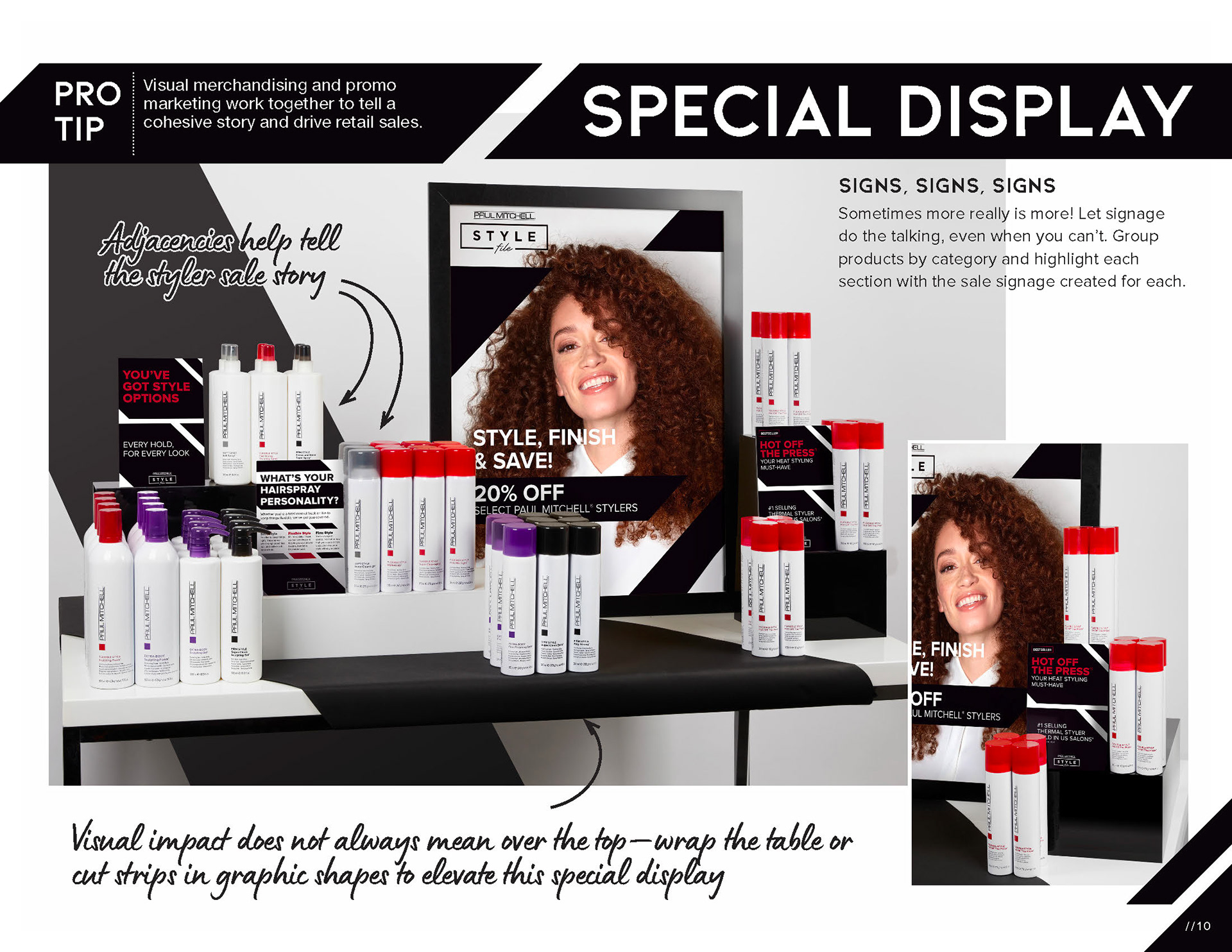 "The Planner" is a quarterly brochure given to salons and vendors to show them how to merchandise and display the newest JPMS product releases. All of the POPs featured in the examples are included with the brochure. For each Planner I was usually given some art direction by the merchandising department, but otherwise I would have free reign to design while making sure I kept on brand. I would also collaborate with Jennifer Zappia, the production manager, when the project featured multiple product focused planners.