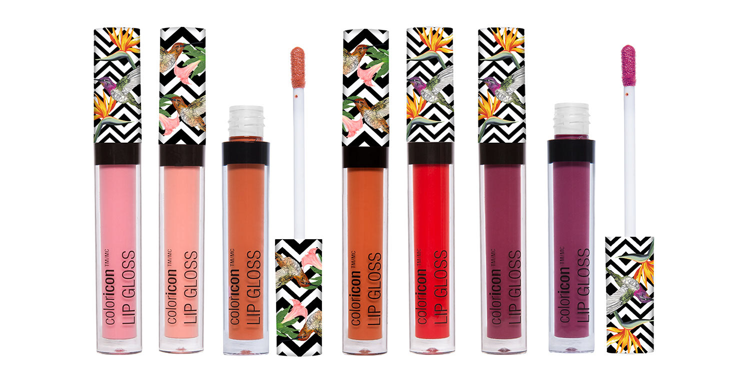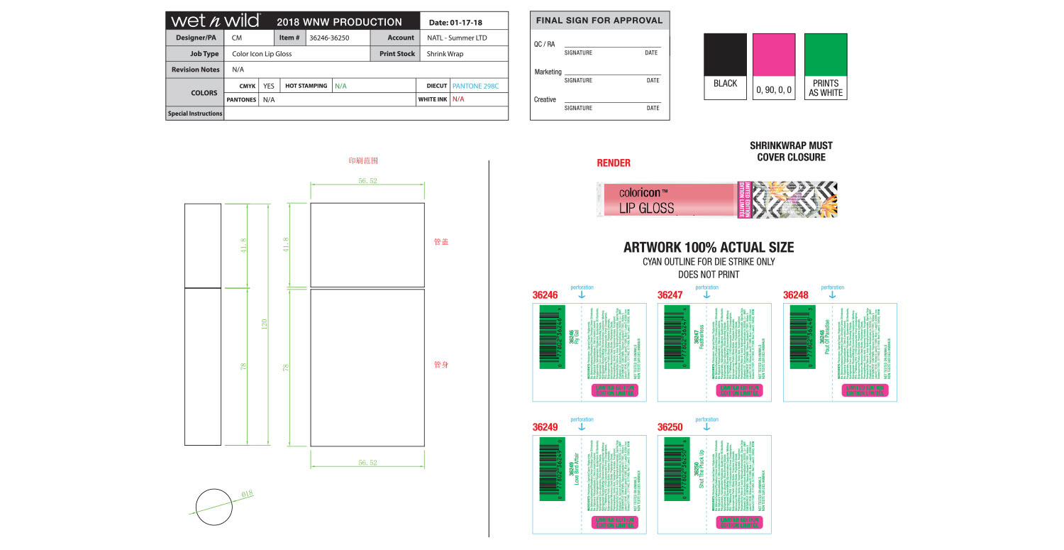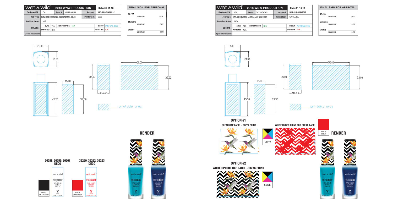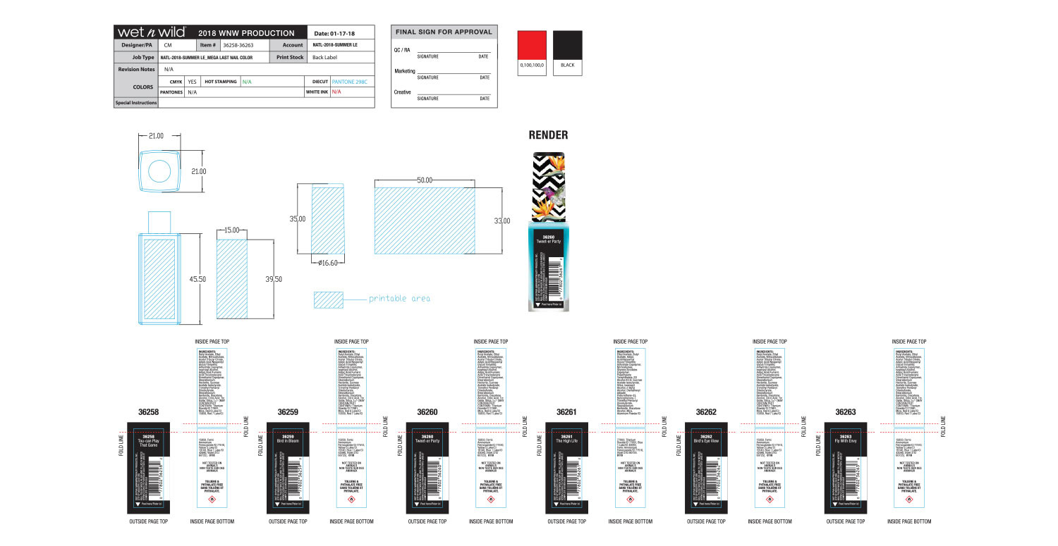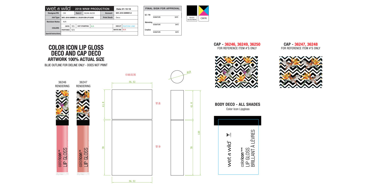 Hummingbirds and Birds of Paradise are the theme of this collection, which was the brainchild of our Vice President at the time. Our art director laid out the initial design, and it was my job to make sure that the execution was perfect. The wraparound artwork on the lip gloss caps as well as the primer water spray were the most difficult to get right. This was also the first time we did a fade out gradient, shown on the eyeliner caps.