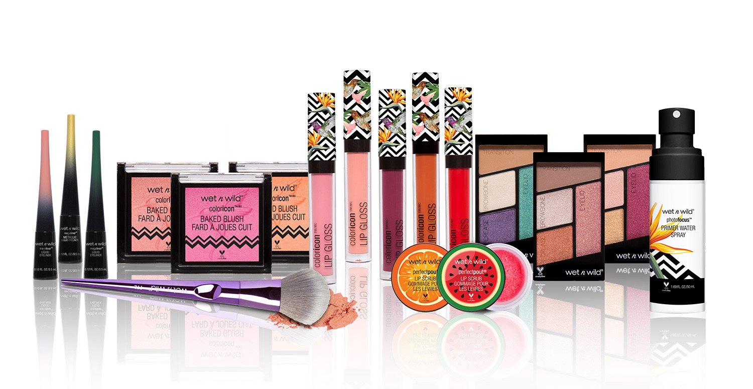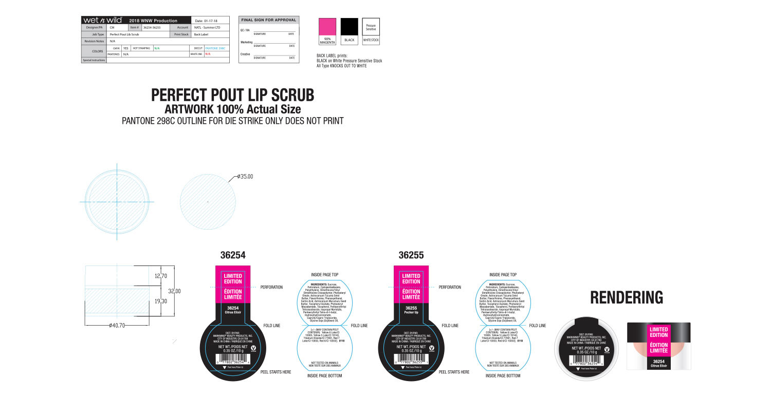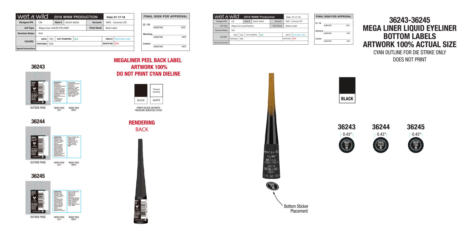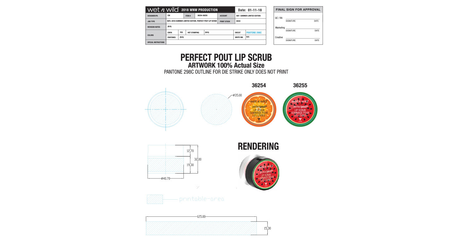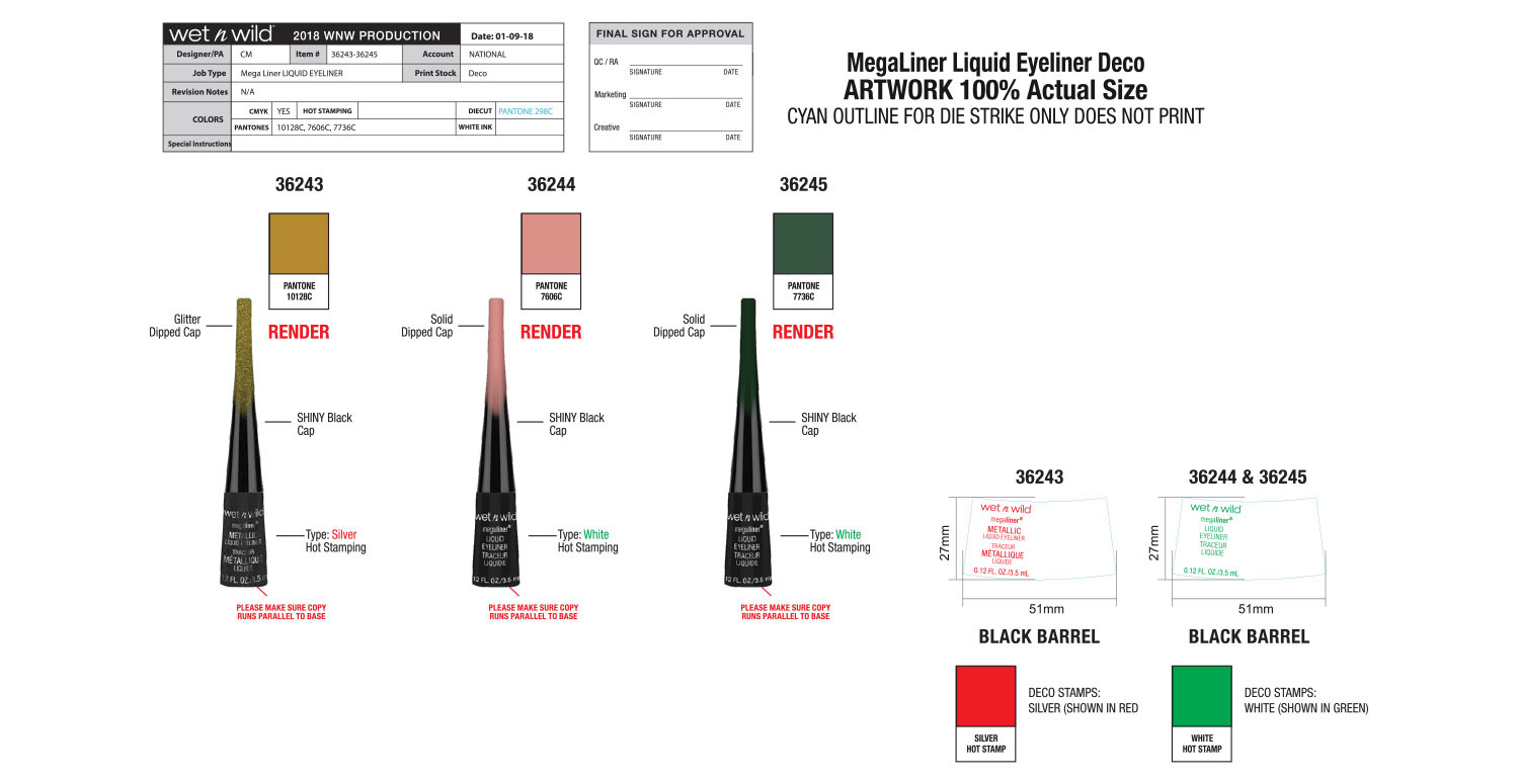 Hummingbirds and Birds of Paradise are the theme of this collection, which was the brainchild of our Vice President at the time. Our art director laid out the initial design, and it was my job to make sure that the execution was perfect. The wraparound artwork on the lip gloss caps as well as the primer water spray were the most difficult to get right. This was also the first time we did a fade out gradient, shown on the eyeliner caps.