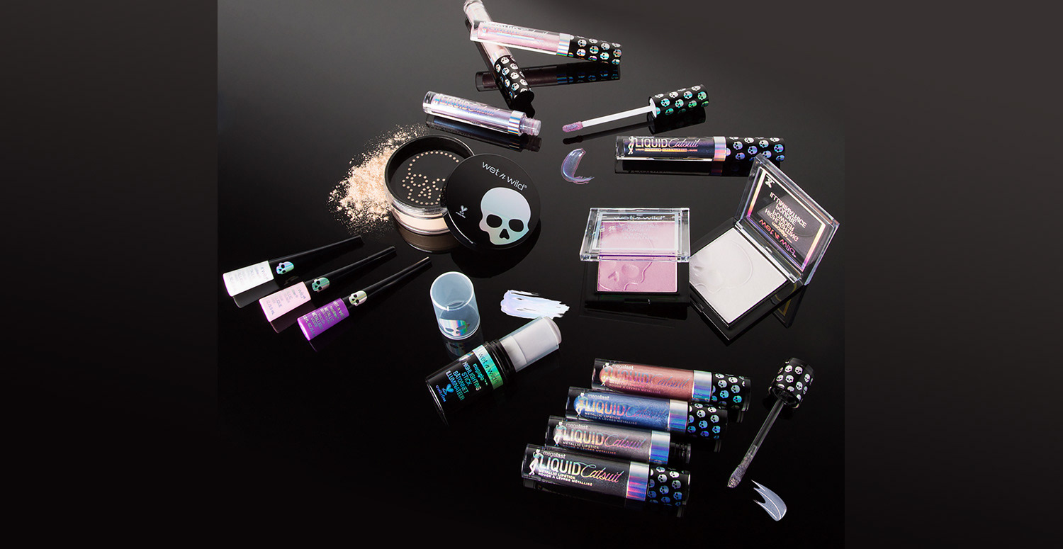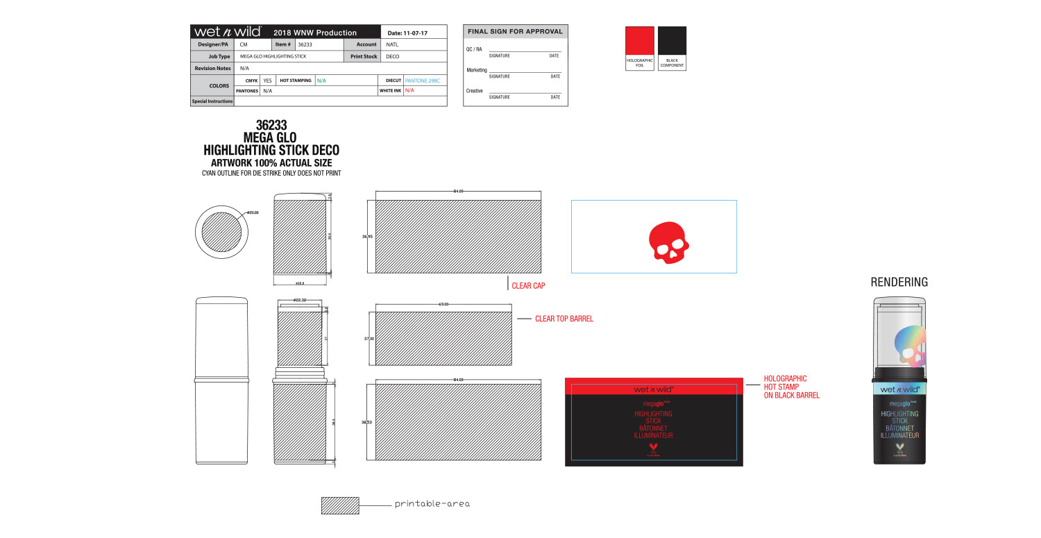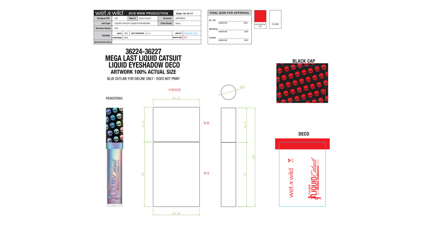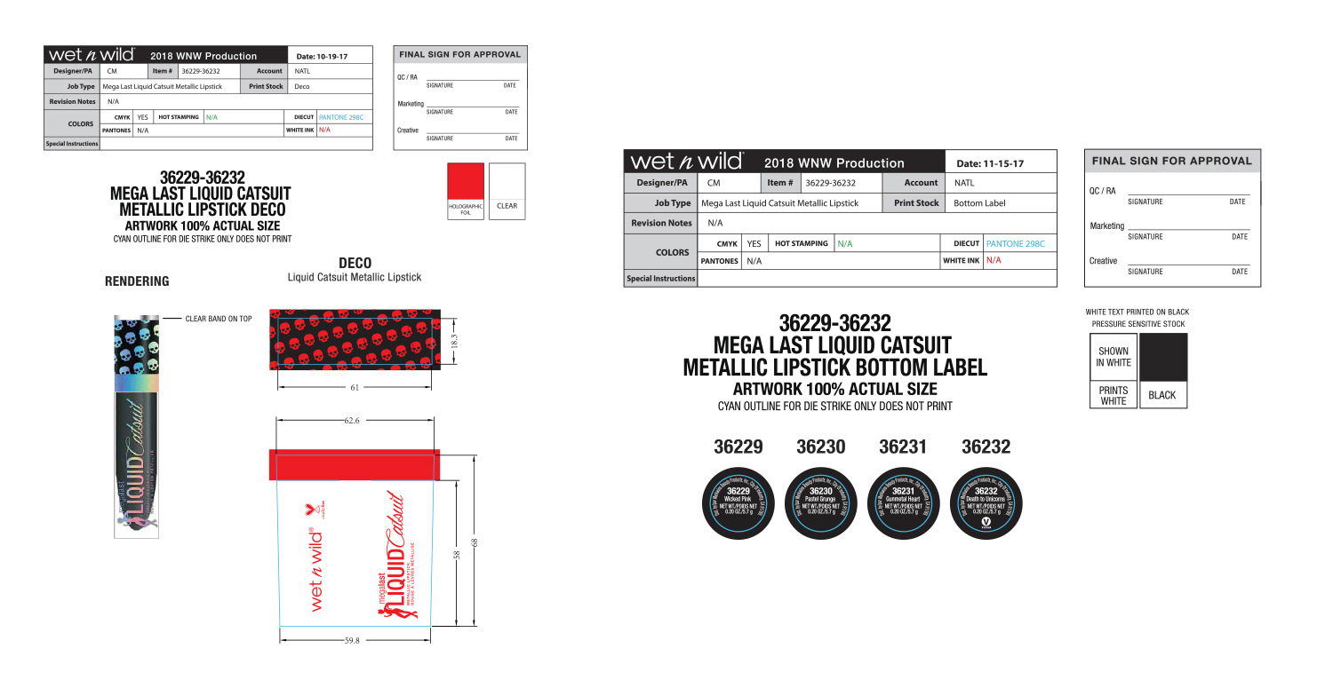 The overall theme for this collection was holographic skulls. Initial concept and design were by the art director, and I handled all primary and secondary packaging. One of the more difficult aspects of this project was making sure the wraparound skull pattern on the lip gloss and liquid lipstick was seamless. Our China factory did a terrific job making sure it turned out great.