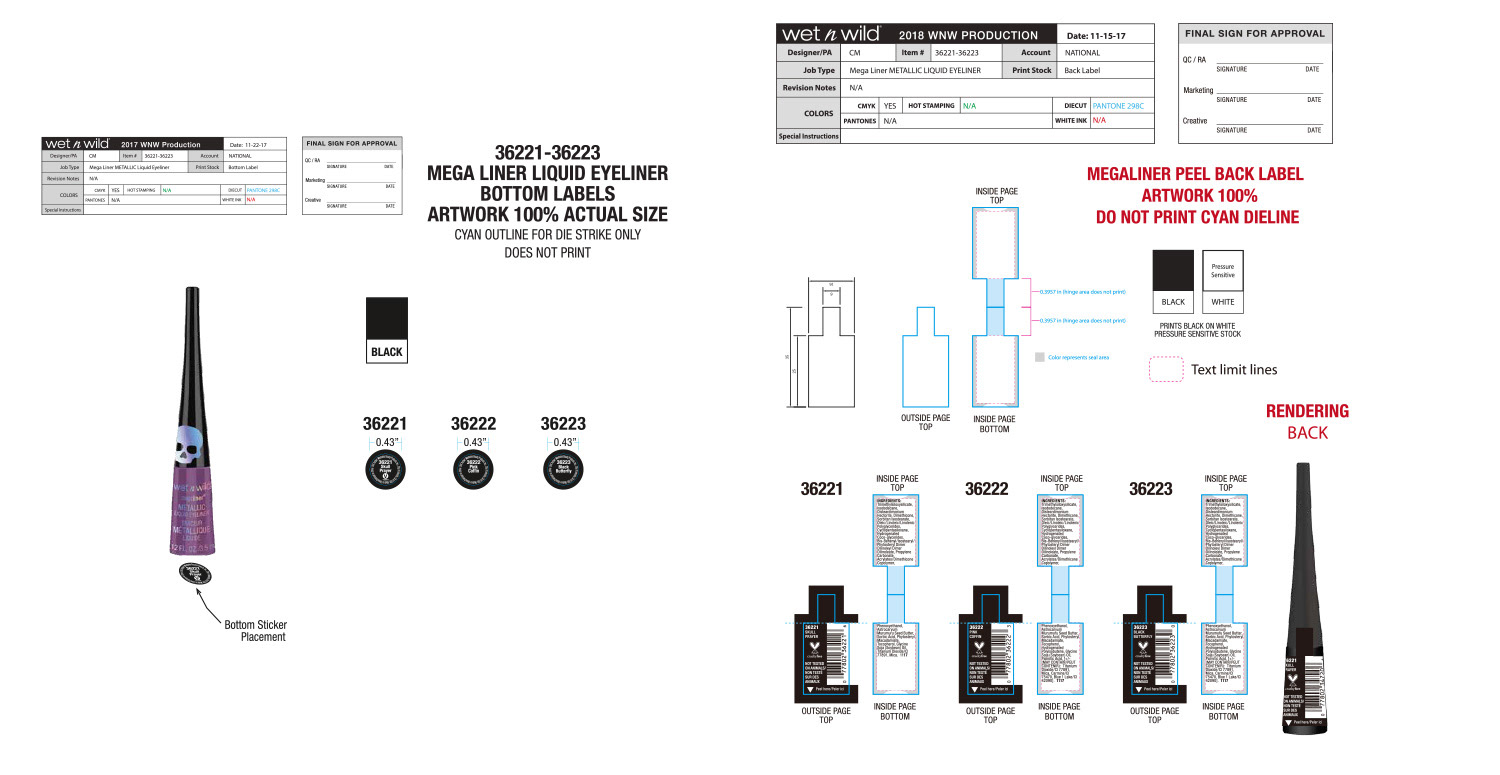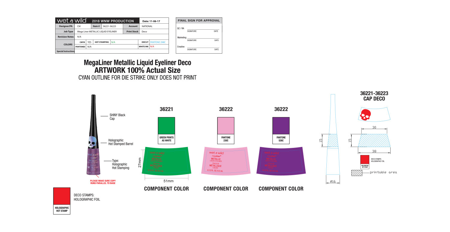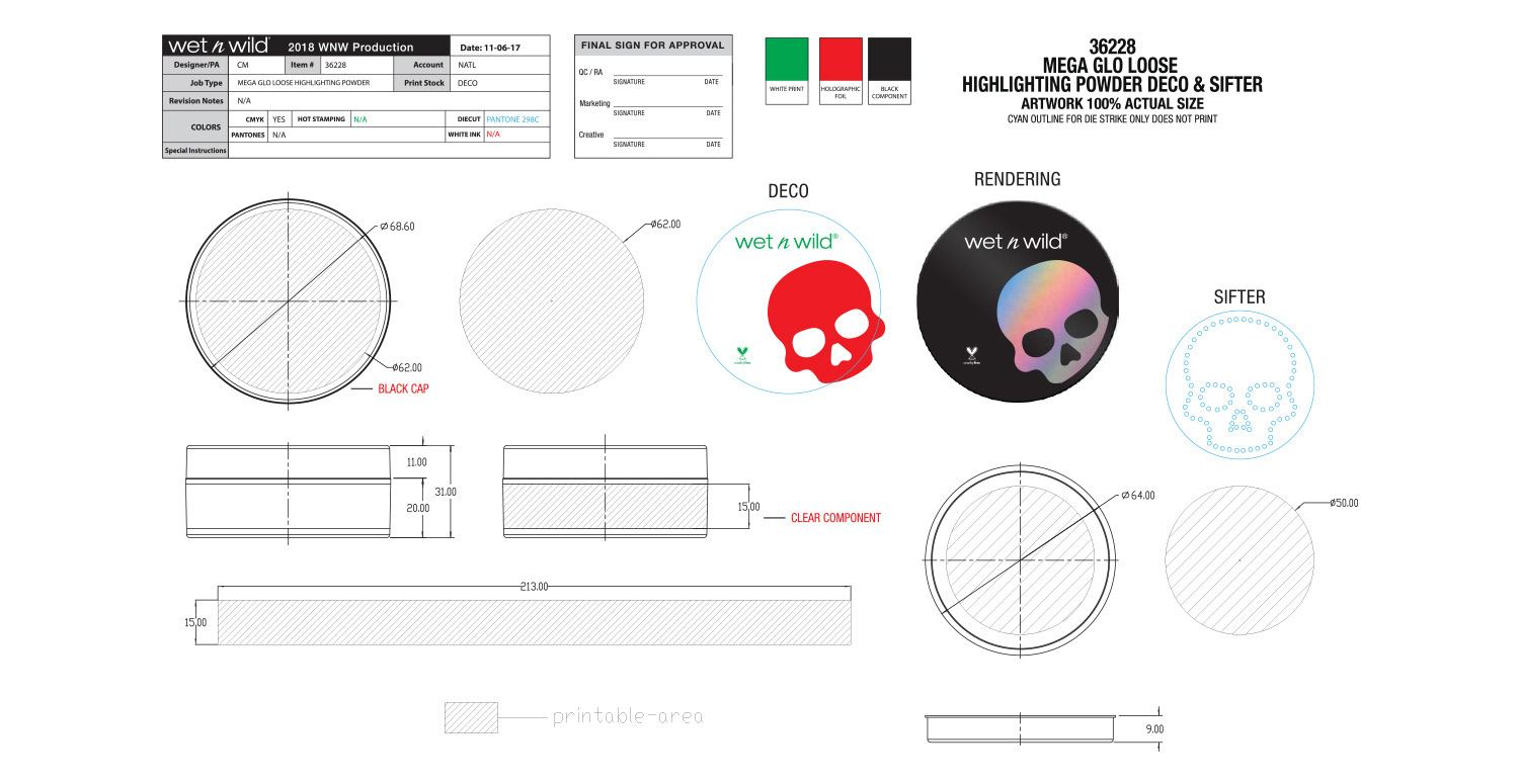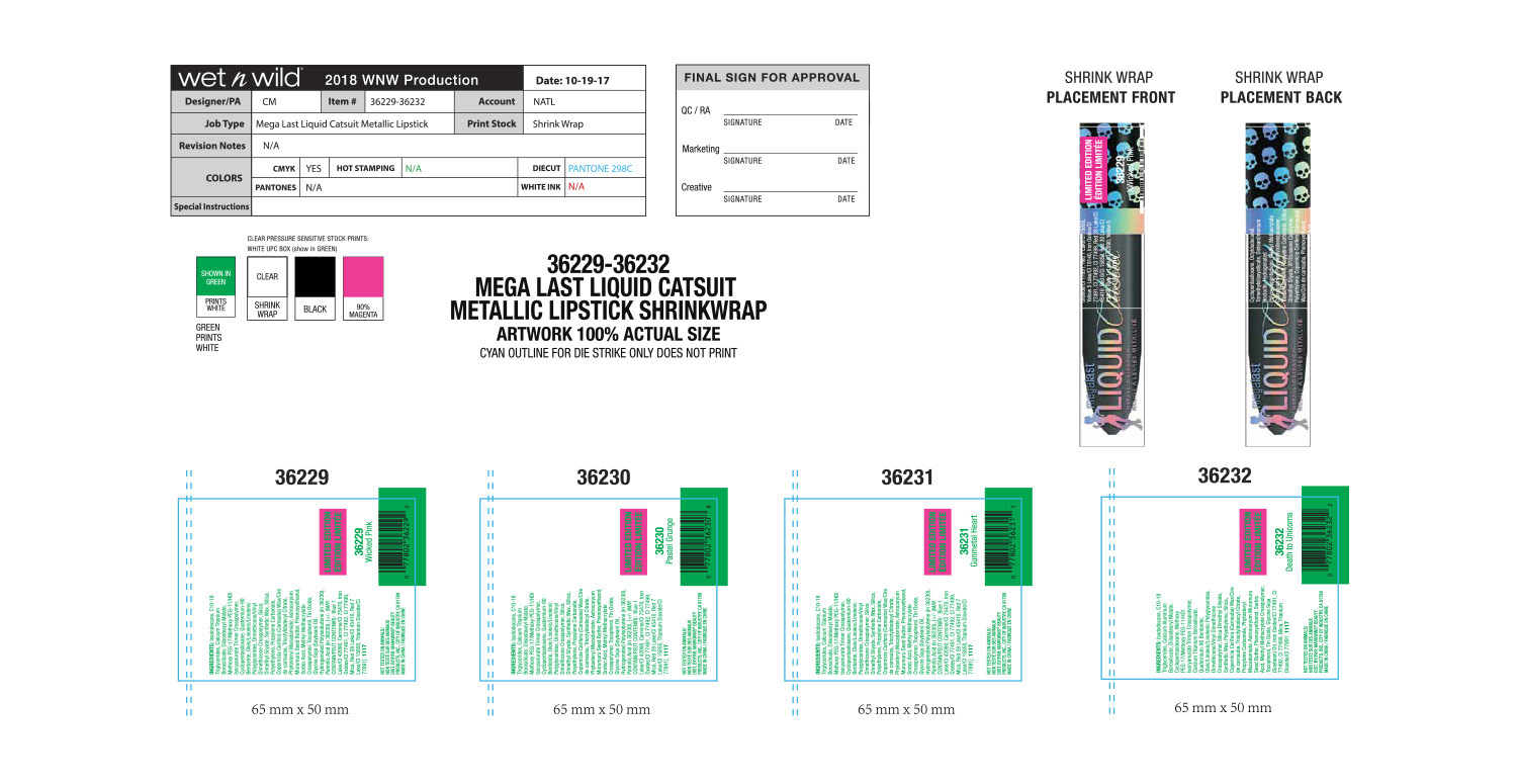 The overall theme for this collection was holographic skulls. Initial concept and design were by the art director, and I handled all primary and secondary packaging. One of the more difficult aspects of this project was making sure the wraparound skull pattern on the lip gloss and liquid lipstick was seamless. Our China factory did a terrific job making sure it turned out great.
