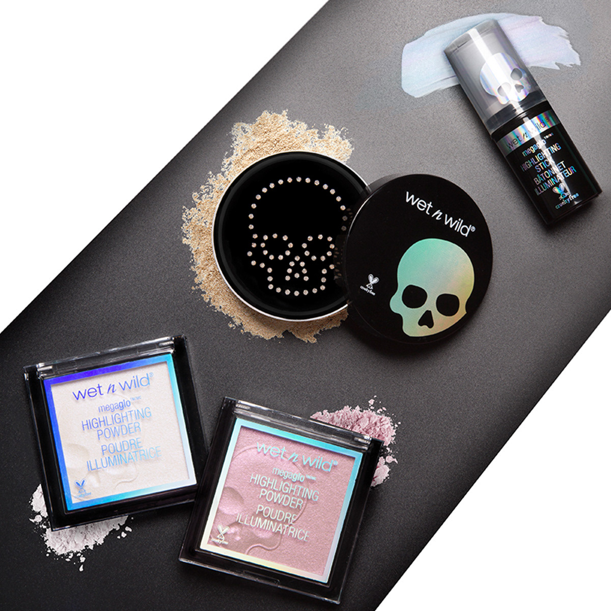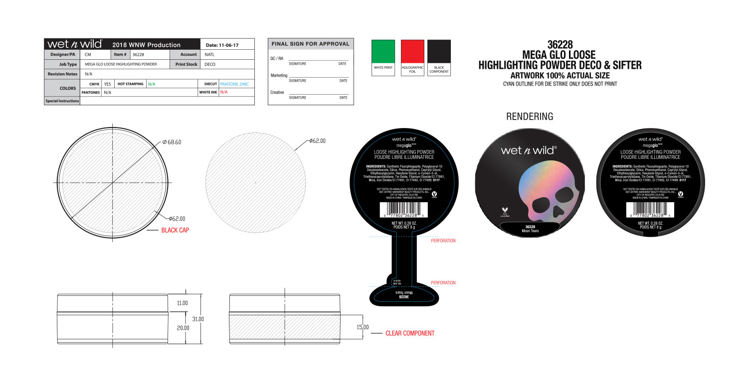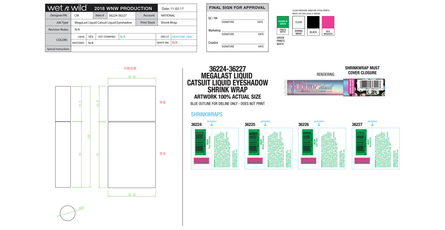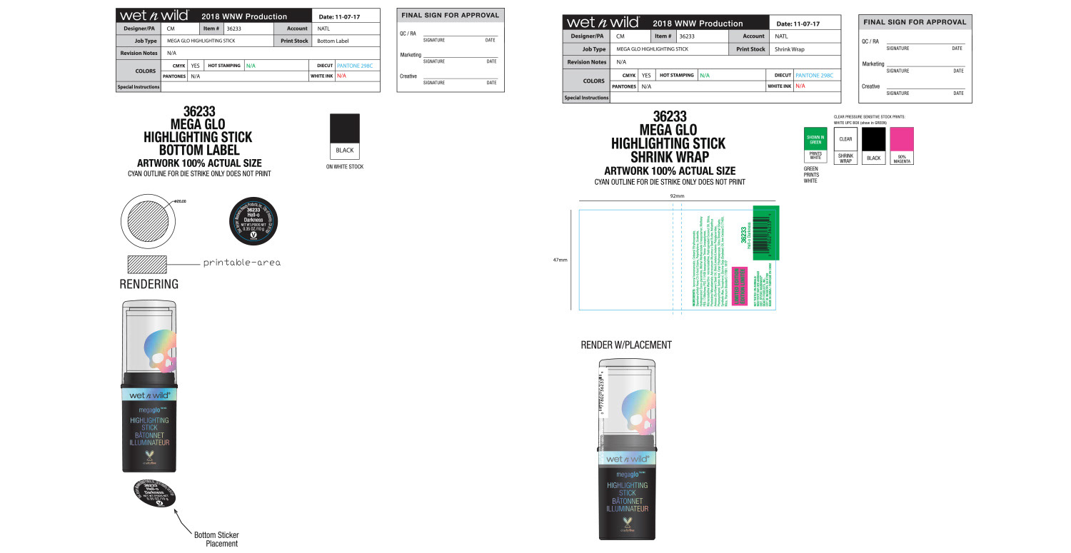 The overall theme for this collection was holographic skulls. Initial concept and design were by the art director, and I handled all primary and secondary packaging. One of the more difficult aspects of this project was making sure the wraparound skull pattern on the lip gloss and liquid lipstick was seamless. Our China factory did a terrific job making sure it turned out great.